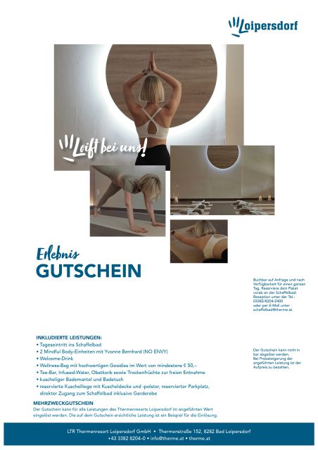 Tageseintritt ins Schaffelbad, Mindful Body-Einheiten mit Yvonne Bernhard (NO ENVY) Mindful Body: 11.00 Uhr und Mindful Body Restore: 16.30 Uhr, Welcome-Drink, Wellness-Bag mit hochwertigen Goodies im Wert von mindestens € 50,–, Tee-Bar, Infused-Water, Obstkorb sowie Trockenfrüchte zur freien Entnahme, kuscheliger Bademantel und Badetuch, reservierte Kuschelliege mit Kuscheldecke und -polster, reservierter Parkplatz, direkter Zugang zum Schaffelbad inklusive Garderobe